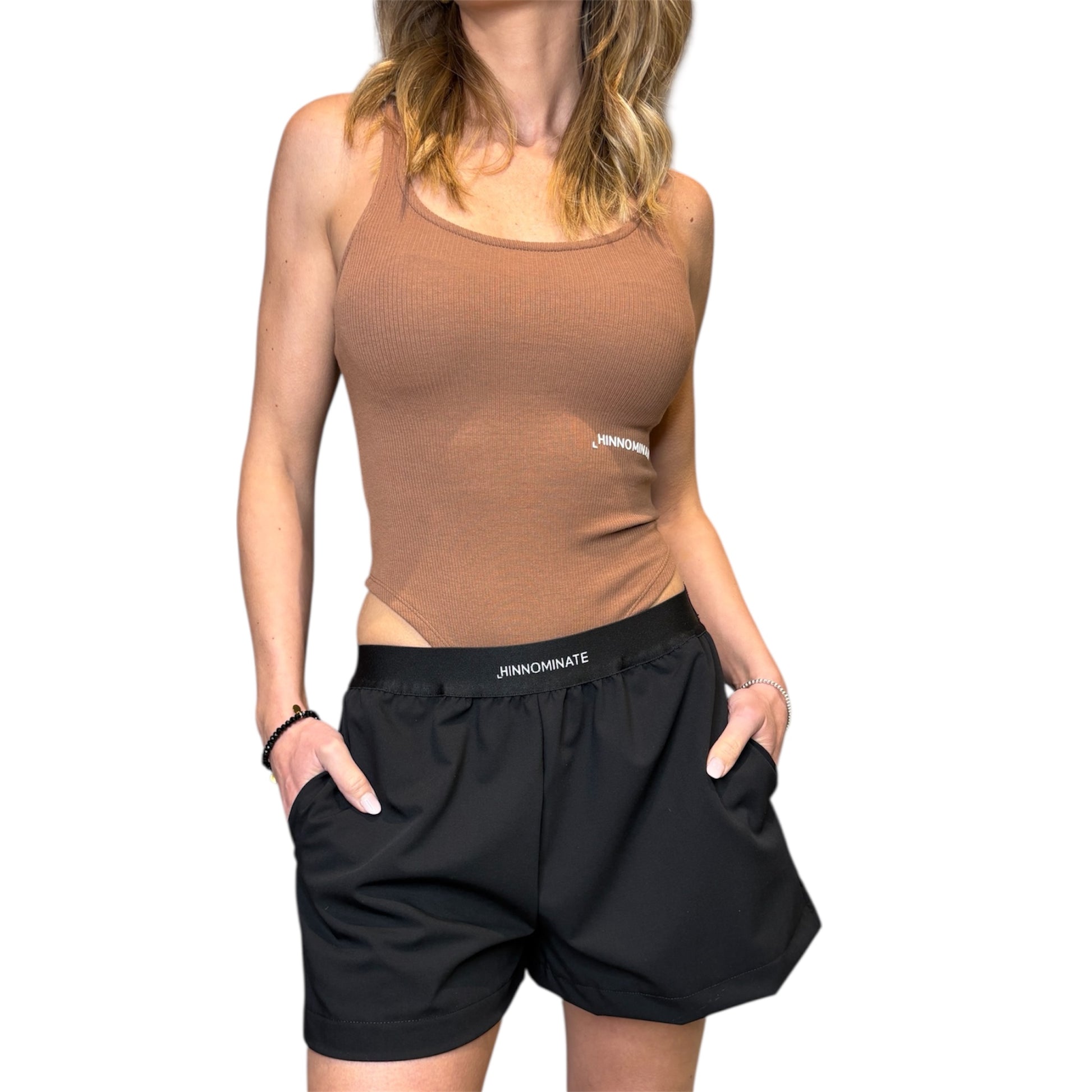 Body da donna firmato Hinnominate, realizzato in morbido tessuto a costine elasticizzato che aderisce al corpo valorizzando la silhouette. Il design essenziale con spalline strette e scollo arrotondato lo rende un capo femminile e versatile, ideale sia da solo che come base per look stratificati.