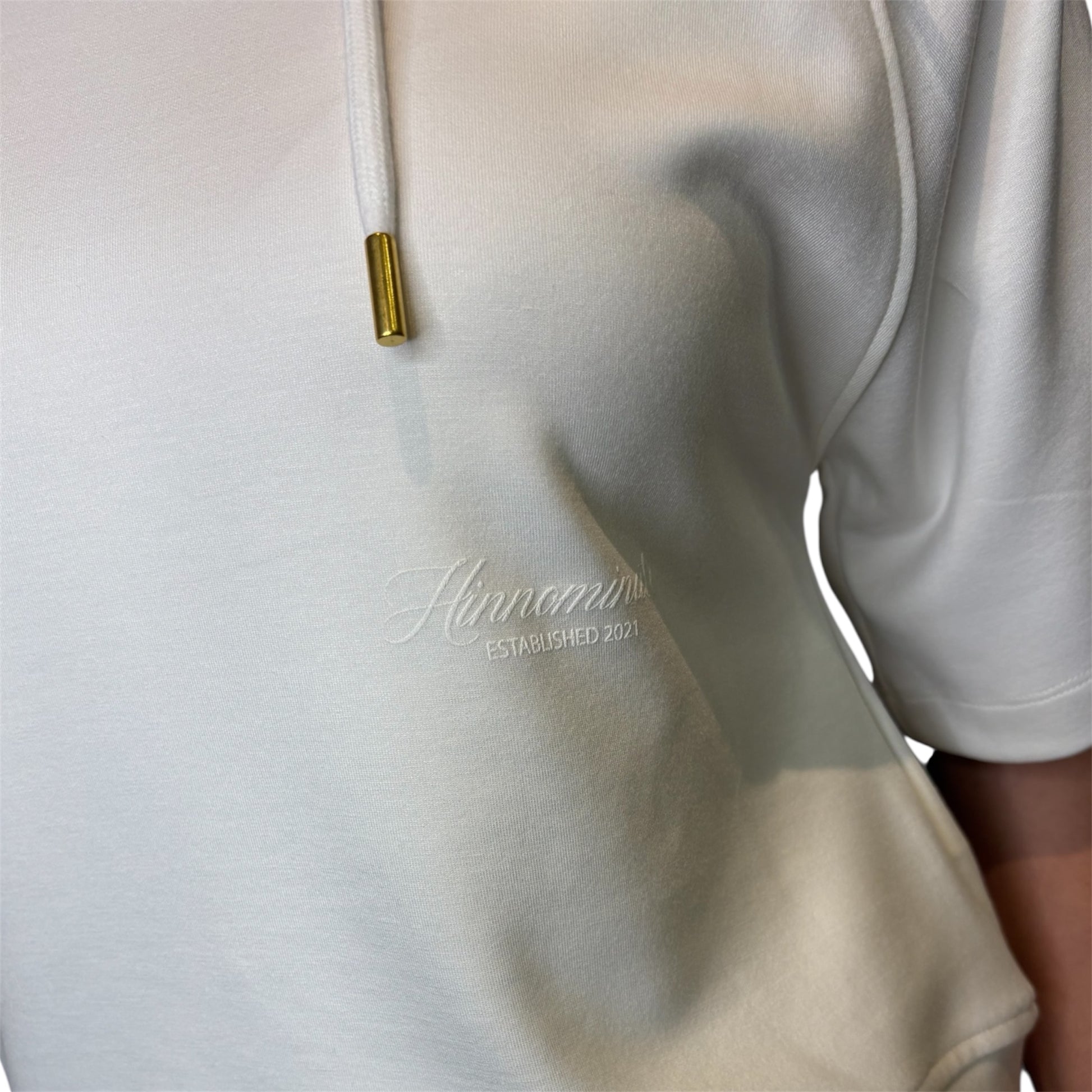 Il modello è caratterizzato da cappuccio con coulisse rifinita con terminali metallici, maniche corte dal taglio ampio e fondo leggermente strutturato che dona equilibrio alla silhouette. Il dettaglio distintivo è la banda laterale satinata sulle maniche, che aggiunge un tocco elegante e luminoso. Il logo Hinnominate tono su tono sul davanti completa il capo con discrezione e stile.