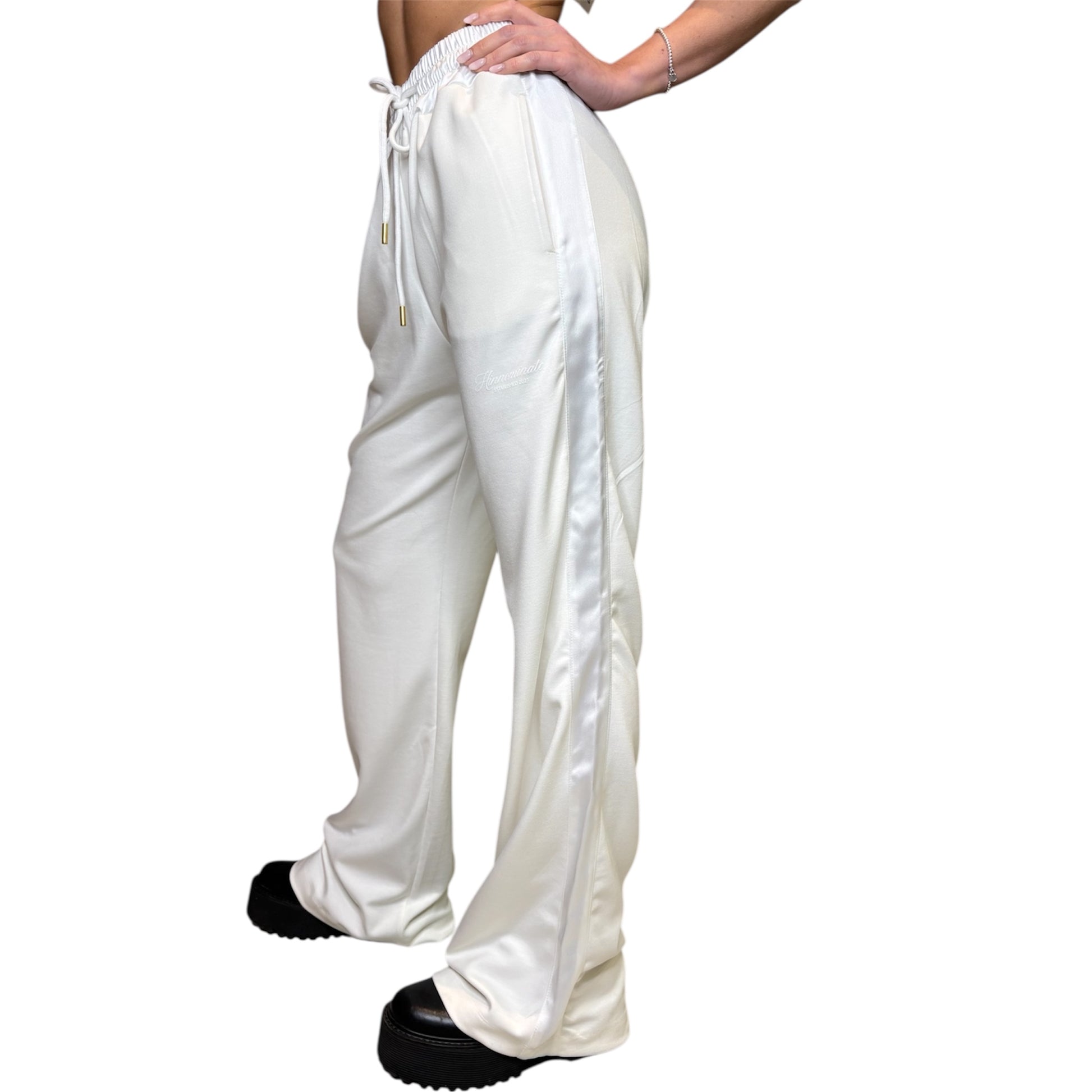 Il modello presenta vita elasticizzata con coulisse regolabile, tasche laterali e gamba dritta e ampia che slancia la figura. Il dettaglio distintivo è la banda laterale satinata tono su tono, che dona luminosità e un tocco chic al capo. Il logo Hinnominate discreto completa il design con un accento iconico ma minimal.