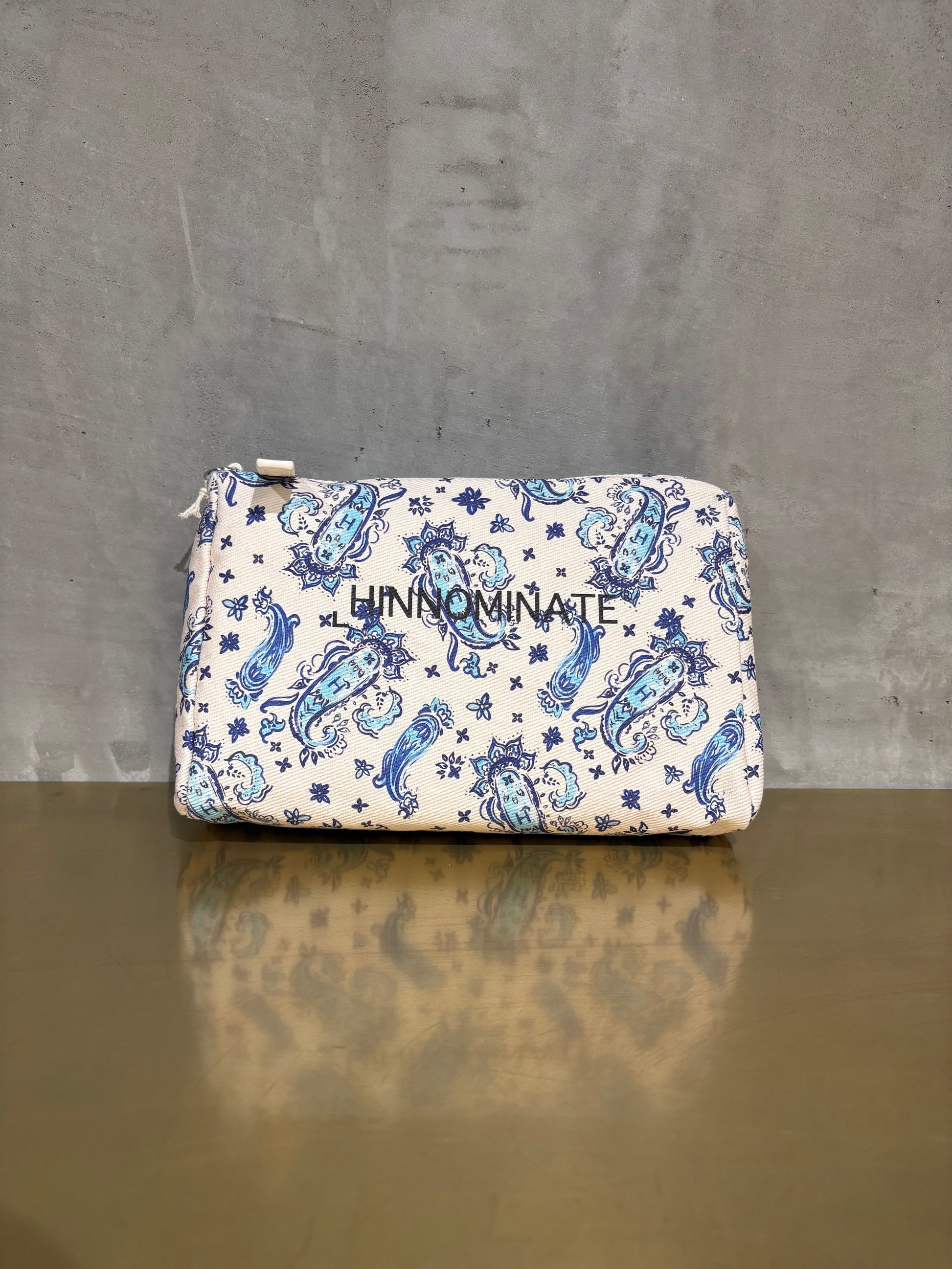 Pochette firmata HINNOMINATE, realizzata in tessuto resistente con elegante stampa bandana all-over nei toni del blu e dell’azzurro su fondo chiaro. Il design compatto e raffinato è impreziosito dal logo frontale a contrasto, che rende l’accessorio immediatamente riconoscibile.
